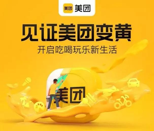 这次美团变颜色,其目的是将所有线上线下曝光进行视觉化统一,从流量到品牌一体化,让大家看到黄色就会想到美团的贴心服务,这个黄色叫做——美团黄。